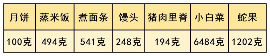 以上面100g月饼的能量是2342kJ为例,100g米饭所含的能量是485kJ,吃1块100g的月饼,相当于吃了1斤左右(494g)的米饭。
