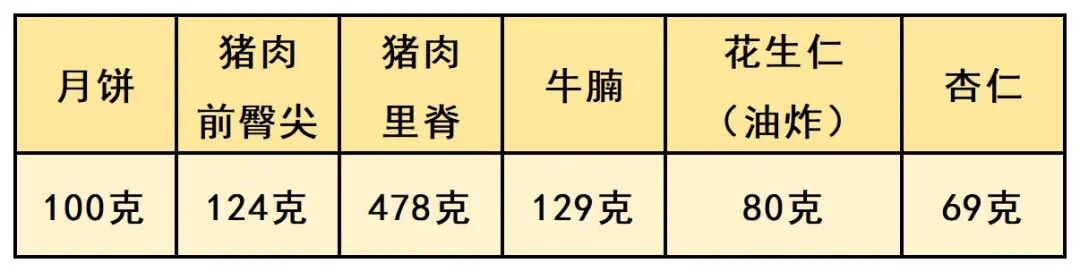 以上面100g月饼的脂肪含量37.8g为例,吃一块100g的月饼摄入的脂肪相当于吃1斤左右(478g)的猪肉里脊摄入的脂肪。